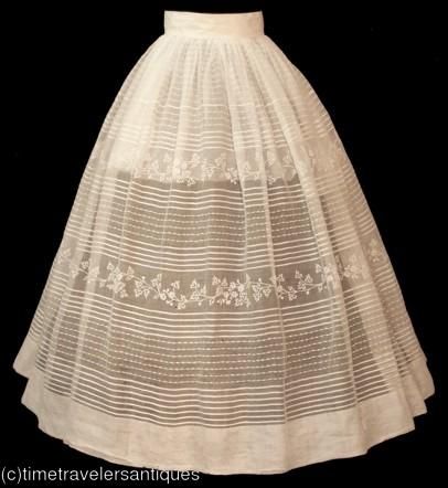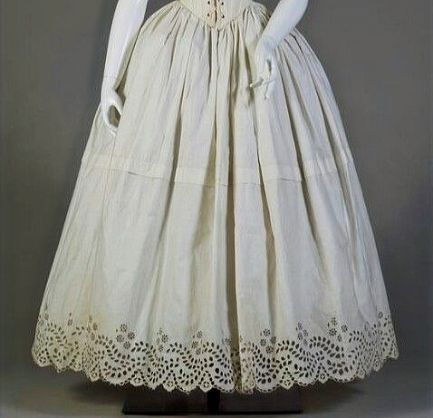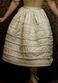 If the weather is fine, you'll skip the padding and be wearing just a corded petticoat. These were the prequel to the crinoline cage. They were not as bulky in giving skirts that bell shape. No dress was complete without them. So yours won't be either. Then, atop that, you can have up to three (some say four) petticoats of a lighter material. Though "lighter" material was often included in bulk, such as rows of lace or tulle.
